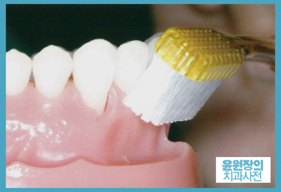 칫솔을 닦을 면에 붙이고 칫솔의 윗부분(솔의 끝부분)을 잇몸쪽으로 돌리세요.