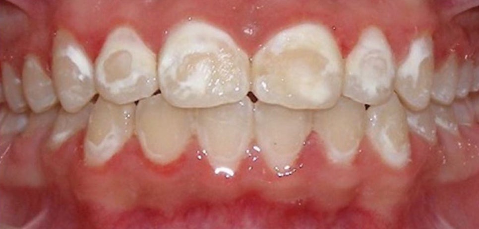 법랑질이 실제로 파괴되기 때문에 빛 반사가 다르게 보여요.