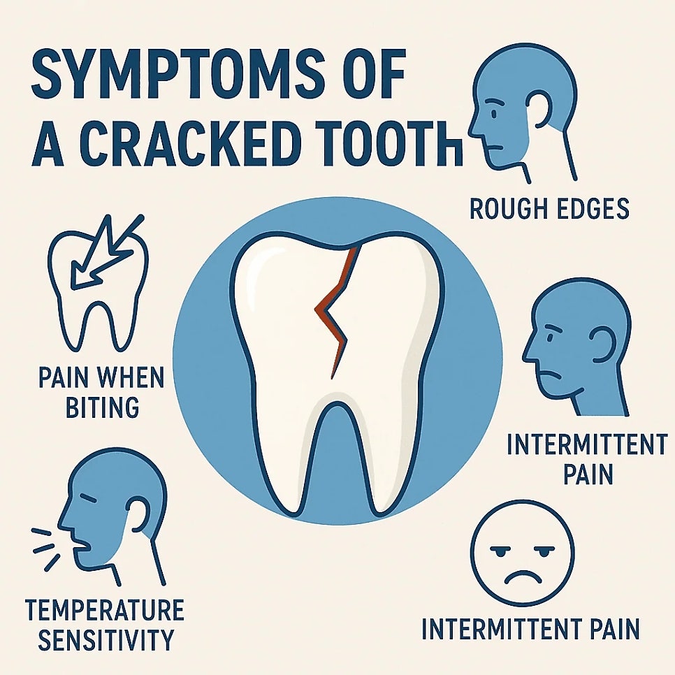 치아에 크랙(균열)이 생겼을 때 발생할 수 있는 증상들을 나타낸 그림입니다. 씹을때 통증이 생기고, 온도에 통증이 민감해지는게 특징입니다. (출처: https://www.citydentists.co.nz)
