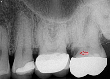 크라운 하방에 2차 충치가 생긴 x-ray 사진입니다. 빨간색 화살표를 따라가보시면 원래 흰색으로 치아가 있어야 되는 자리가 검정색으로 되어있습니다(x-ray 사진에서는 검정색이 빈공간, 흰색이 무언가 있다는 뜻입니다) 즉, 2차 충치가 생겨서 파먹은 공간(cavity)가 생긴 셈입니다. (출처: https://www.atlasdental.ca/)