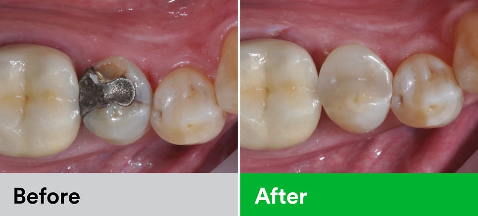 레진으로 충치를 치료한 모습입니다. 기존엔 아말감으로 치료가 되어있었는데요, 주변에 충치가 다시 생기자, 이번엔 레진으로 수복한 모습입니다 (출처: https://www.3mindia.in/)
