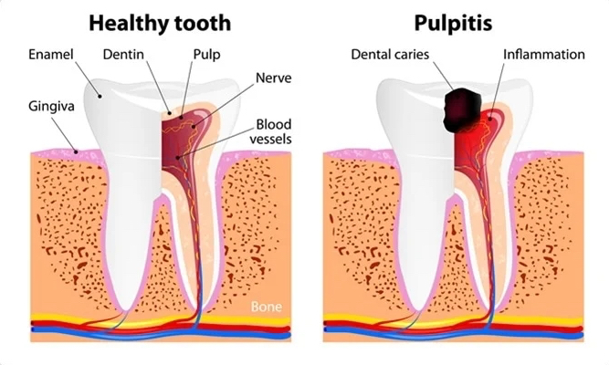 왼쪽은 건강한 치아, 오른쪽은 치수염이 있는 치아입니다. 치수염이란 치수(신경)에 염증이 생긴 상황을 말합니다 (출처: https://www.news-medical.net/)