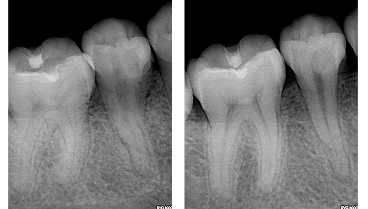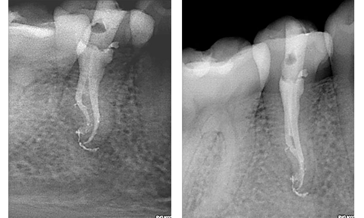 왼쪽 2개의 사진에서 치아가 2개 있는데요, 둘 중에 오른쪽 치아가 괴사된 치아입니다. 그리고 오른쪽 2개의 사진은 신경치료를 한 치아의 엑스레이 사진입니다.(출처: https://zarc4endo.com/)