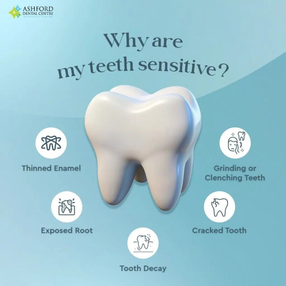 치아가 민감할 수 있는 원인들을 나타낸 그림입니다. 치아는 겉에서부터 에나멜(법랑질)층, 덴틴(상아질)층 그리고 신경(치수)로 이루어져 있는데요, 덴틴(상아질)층이 충치로 인해 노출되게 되면, 시린 증상이 나타나게 됩니다. (출처: https://ashforddentalcentre.com)