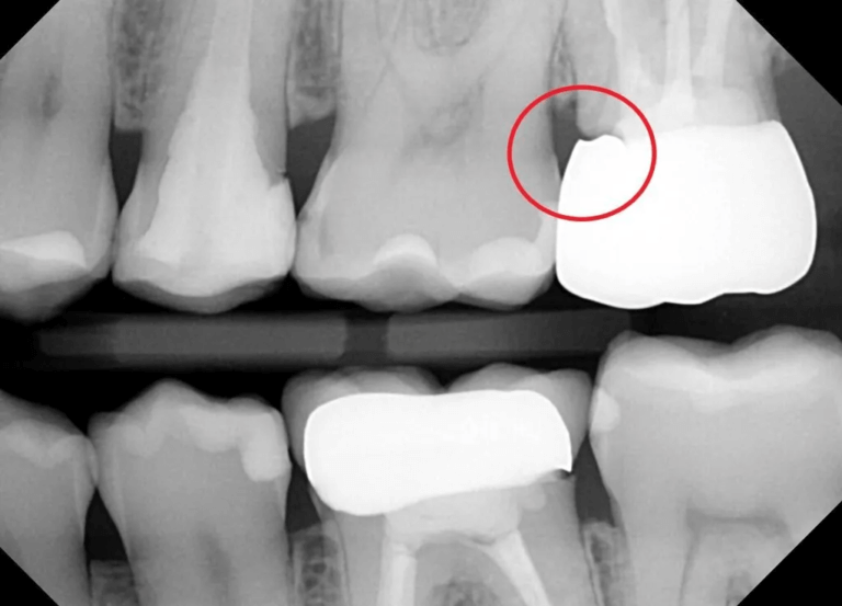 크라운의 엑스레이 사진입니다. 엑스레이 사진에서 크라운은 다른부분보다 하얗게 보입니다. 빨간색 동그라미 부분을 보시면 치아와 크라운 사이에 틈이 있는걸 볼 수 있습니다. 검정색 부분이죠. 엑스레이에서 검정색 부분은 빈 공간이라는 겁니다. 이처럼 크라운과 치아 사이에 적합도가 떨어지게 되면 그때 문제가 발생하게 되는겁니다. (출처: https://atlasdental.ca/)