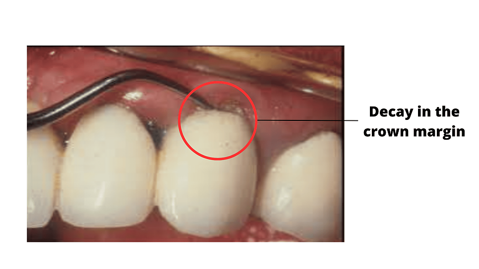 위 그림처럼 크라운의 마진, 즉 가장자리 부분에 관리가 잘 안되게 되면 치아가 썩어 문제가 발생할 수 있습니다. 크라운의 가장 흔한 문제점 중 하나이죠. (출처: https://www.tooth-life.com/cavity-under-crown.php)