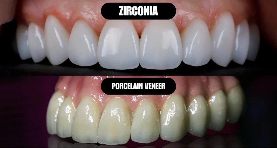 지르코니아와 세라믹 비니어 치료를 나타낸 그림입니다. 재료도 수명을 결정합니다. (출처: https://glenburniedentalgroup.com/)