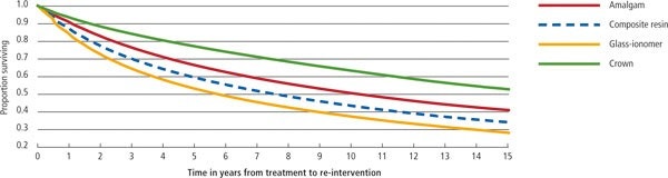이 그래프는 시간에 따른 각각의 치료의 수명을 나타낸 것입니다. 빨간색은 아말감, 파란색은 레진, 노란색은 GI, 그리고 크라운은 초록색인데요, 크라운이 가장 수명이 길고 오래 쓸 수 있는걸 알 수 있습니다. 그래도 15년 정도 지나면 절반의 확률로 계속 쓸 수 있습니다 (출처: https://www.nature.com/articles/sj.bdj.2018.523)