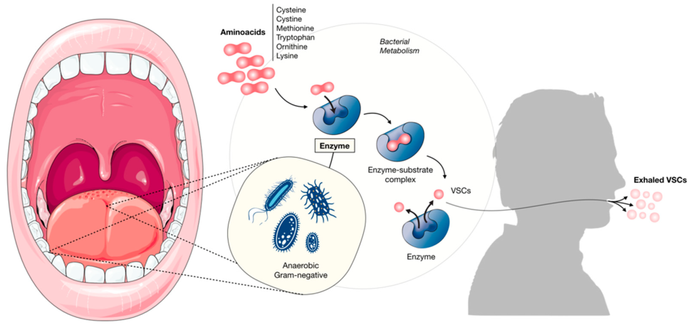 입냄새가 생기는 원리를 나타낸 그림입니다. 치석이나 혀의 돌기에 있는 그람음성 혐기성균의 효소를 통해서 아미노산을 황화합물(VSCs)로 만들어 입냄새가 나게 됩니다. (출처: https://doi.org/10.3390/ijerph191811303)