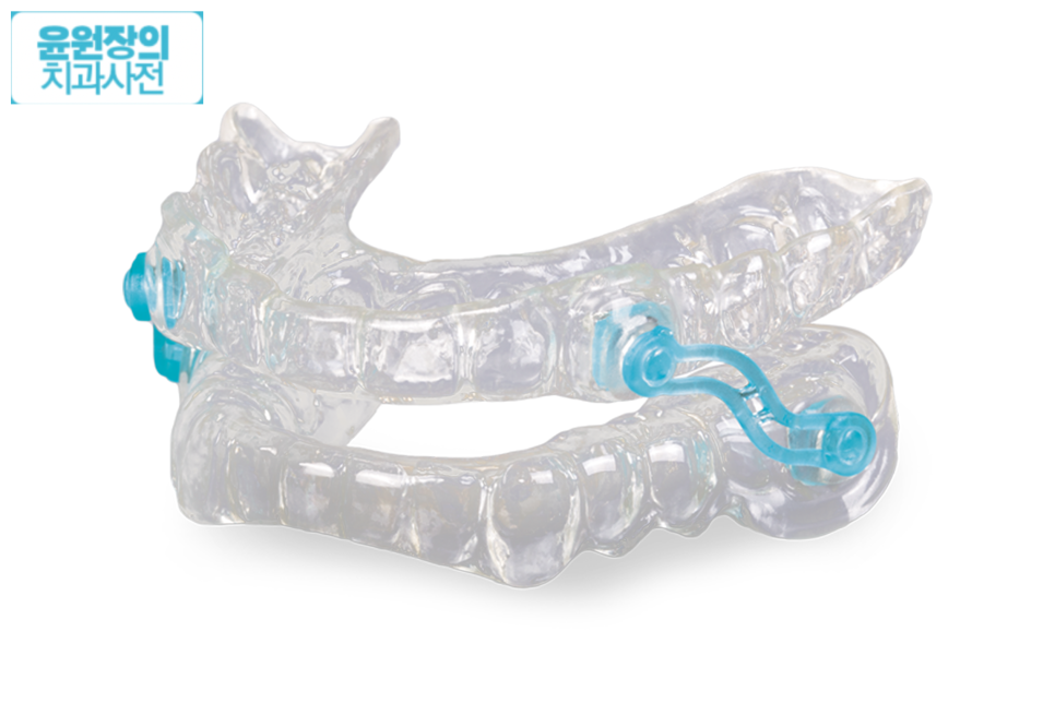 입안에 장치를 끼는 것이죠. 잘때 장치를 끼고 자게 되면, 장치에 의해 아래턱이 앞으로 나온 상태가 되서 공기통로를 확보해주는 원리입니다.