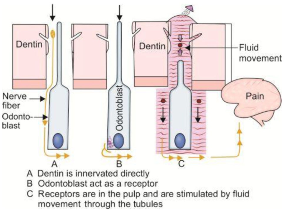Hydrodynamic theory (유체역학가설)을 나타낸 도식입니다. 차가운 자극을 받으면 상아질 안의 상아세관이 영향을 받아 이동해서 신경을 자극하게 됩니다. (출처: https://thefuturedentistry.com/)