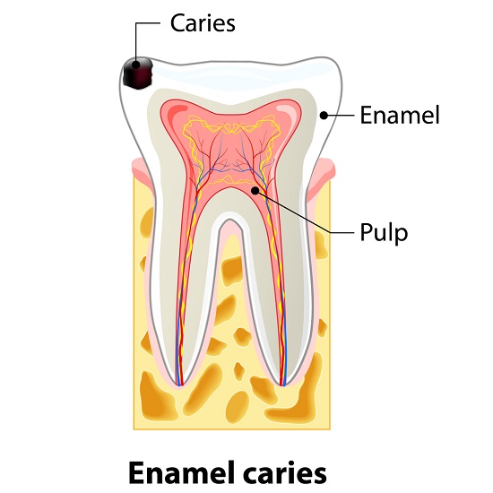 초기충치 그림. 가장 표면의 층인 법랑질(Enamel)에 작은 틈이 생기기 시작한 상태에서 단맛이 닿으면 안쪽의 상아세관의 삼투압을 자극하게 됩니다. (출처: https://www.ar32.in/)