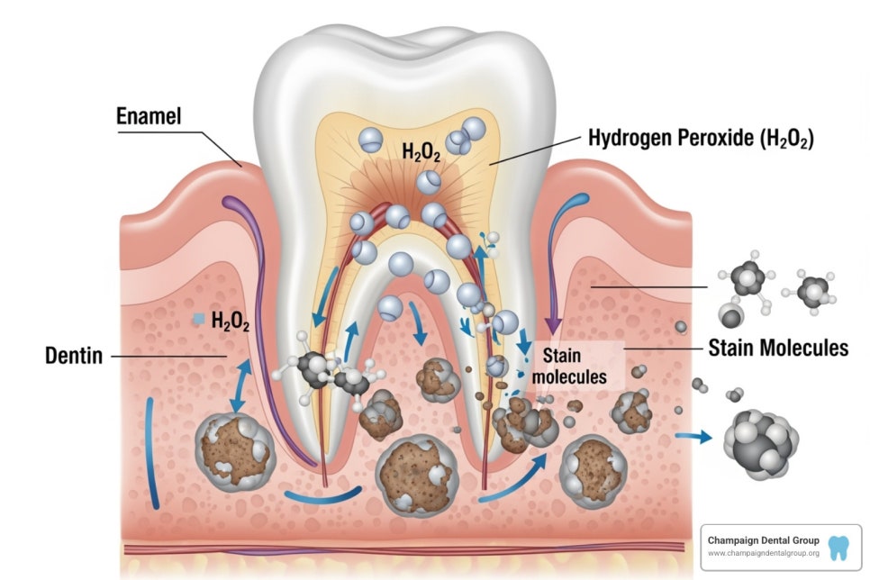 치아의 착색분자들을 어떻게 미백을 통해 제거하는지 나타낸 그림입니다. 보시는것처럼 미백을 하게 되면 과산화수소 분자들이 치아의 내부 에나멜층을 통해 들어가 안에 있는 착색분자들을 분해하게 됩니다 (출처: https://www.champaigndentalgroup.org/)