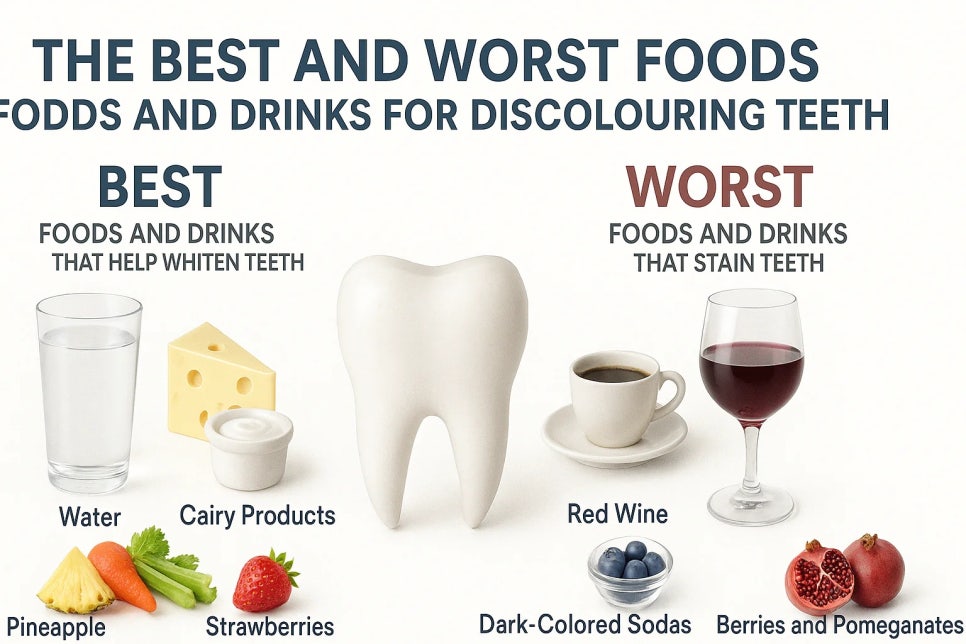 치아미백을 한 후 먹어도 괜찮은 음식들과 먹으면 안좋은 음식들을 나타낸 그림들입니다. 특히나 레드와인, 커피, 베리종류들을 드시게 되면 미백 효과가 줄어들 수 있습니다 (출처: https://sonisk.com/blogs/news/the-best-and-worst-foods-and-drinks-for-tooth-discoloration)