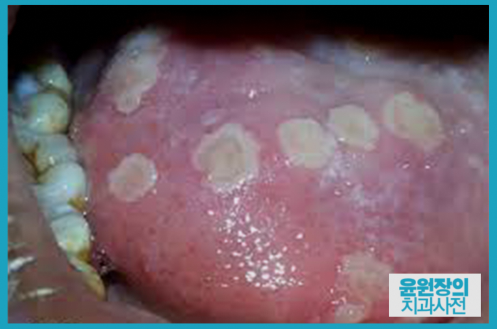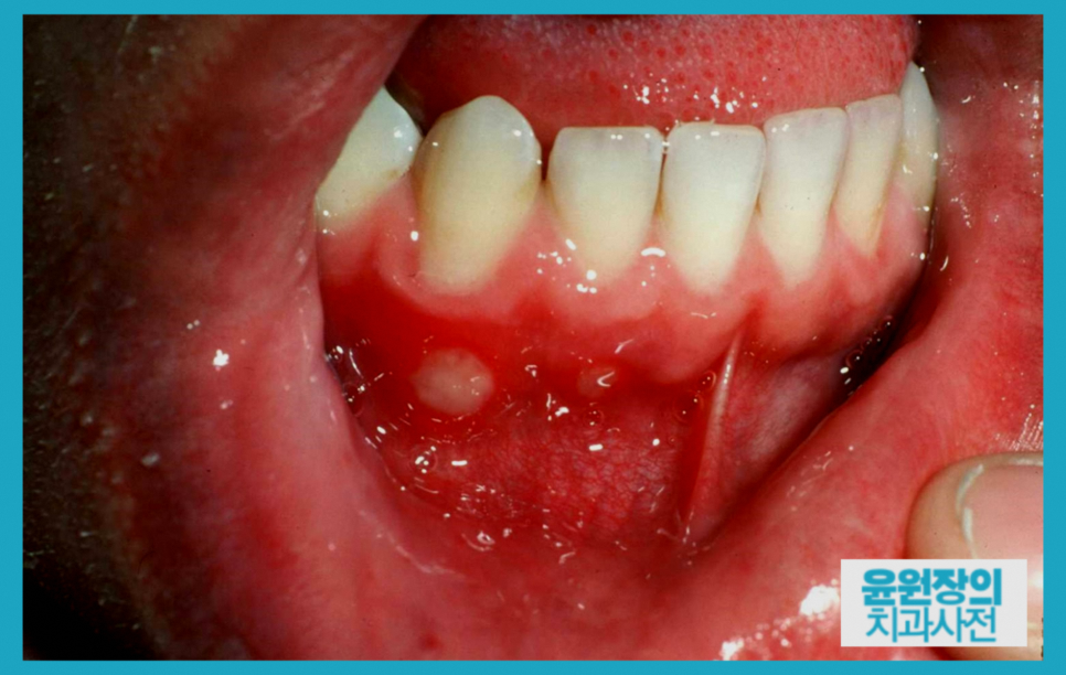 보통 입술이나 치아주변 잇몸에 잘 생기고, 여러개가 동시에 나타나는게 특징입니다.