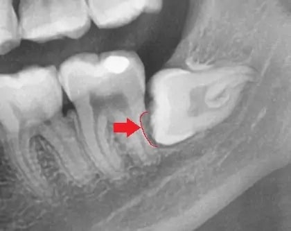 위 x-ray 사진의 경우 빨간색 표시된 부분이 앞 치아(어금니)의 뿌리가 사랑니에 의해 흡수된 경우입니다. 이 경우 발치가 필수에요! (출처: https://www.twinkledental.com)